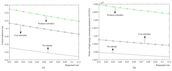 As can be seen from Figure 7a, under the three subsidy modes of no subsidy, cost subsidy and product subsidy, the carbon emission reduction rate and the profits of energy-intensive enterprises decrease with the increase in repayment interest rate. The higher the repayment interest rate, the higher the interest enterprises need to pay, and the more cost enterprises have to pay to invest in low-carbon technology. At this time, enterprises are reluctant to invest in high-level low-carbon technology, and the carbon emission reduction rate shows a downward trend. As costs rise, the profits of energy-intensive enterprises tend to decline. In order to ensure a certain income, enterprises will limit the amount of loans and will not borrow unlimited money from retailers.