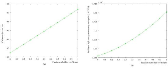 As can be seen from Figure 9a, the carbon emission reduction rate increases with the increase in the product subsidies coefficient. The government subsidizes the product carbon emission reduction, which makes up part of the cost of enterprises’ investment in low-carbon science and technology, thus reducing the cost. In addition, after enterprises invest in low-carbon technology, the higher the level of low-carbon technology input, the bigger the carbon emission reduction, the more product subsidies they get, the higher the market demand of products, the higher the wholesale price and sales price of products, and the higher the sales income of enterprises. For high energy-consuming enterprises, after the government subsidizes their products, they will get higher sales income by investing in low-carbon technology. Compared with without subsidies, they need to pay less cost. Therefore, enterprises are more active in investing in low-carbon technology.