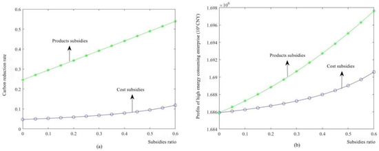 The impact of different subsidies ratio. (a) The impact of different subsidies ratio on carbon reduction rate; (b) The impact of different subsidies ratio on profit.