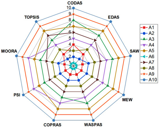 | MCDM Model | CODAS | EDAS | SAW | MEW | WASPAS | COPRAS | PSI | MOORA | TOPSIS |