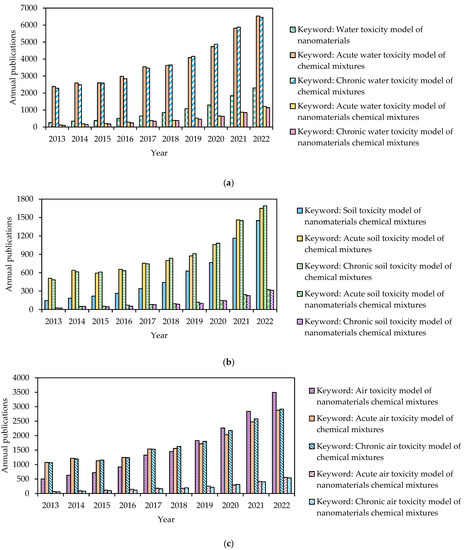 Despite the many advantages of toxicity modeling techniques for chemical mixtures, their application in eco-toxicological studies is seriously lacking. To define in detail the importance of research in toxicity modeling techniques, an analysis has been conducted about scientific publications of three environmental compartments (water, soil, and air) that are highly affected and that affect water quality and sustainability. These selected environmental compartments are specifically related to chemical mixtures, nanomaterials, an acute and chronic toxicity models (Figure 1a–c) which correspond to the studies published in ScienceDirect during the last decade (2013–2022). These areas of study are pillars to several environmental guided studies carried out in the last decade. The area of water toxicity modeling contains approximately 9500 publications that were made until the year 2022 (Figure 1a), from which more than 500 publications were reviewed in the development of this study. From these publications, years 2013 and 2014 presented the lowest number of publications on nanomaterials in chemical mixtures in all the subareas that are shown in Figure 1a. More specific sub-areas, such as acute and chronic water toxicity modeling for nanomaterials in chemical mixtures, show that there has been an increased concern over the last two years on this topic.