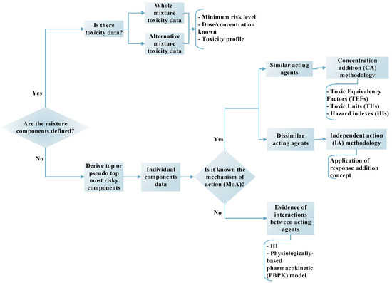 Flow chart of toxicity data availability for chemical mixture assessment on toxicological modeling studies. Adapted from [59].