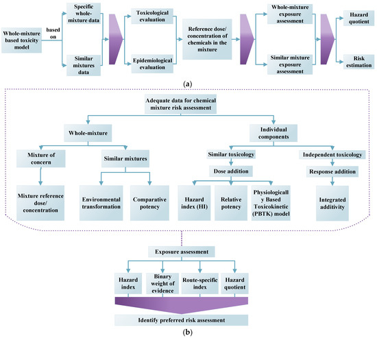 Individual- and whole-mixture -based toxicity models for exposure assessment. (a) Whole-mixture model approach for the estimation of toxicity risk in mixture toxicity. Adapted from [105]. (b) Quality of chemical mixture data for toxicity exposure assessment. Adapted from [105].