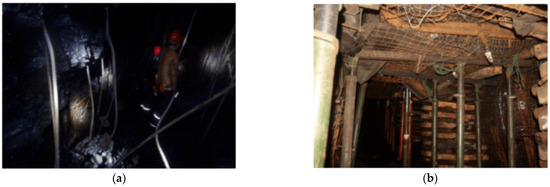 Scene damage of 20 October rock burst accident in Longyun Mine: (a) Anchor bolt bent and suspended; (b) Two sides convergence, roof subsidence.