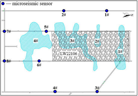 During the mining process on the working face, the water drainage has been carried out through drainage holes. Specifically speaking, the drilling fields and the drainage holes are intensively arranged in the vicinity of the water-rich area, with one drilling field for every 200 m. The diameter of drilling holes for roof water drainage is 91 mm, and the final pitch of the holes is less than 80 m. After the drilling is completed, the gate valve and pressure gauge are installed at the orifice. The gate valve is connected with the drainage pipe and flowmeter for drainage water until the water pressure in the water-rich area is reduced up to the safety mining standard, which is that roof water disasters such as water inrush and sand bursting will not occur in the mining process. The microseismic monitoring system is SOS, developed in Poland [38]. Eight microseismic sensors are arranged around LW22106, among which no. 5 and no. 6 sensors are constantly moved and optimized along with the mining on the working face. These sensors are used to monitor microseismic events in the mining process and capture the precursor information of rock burst.