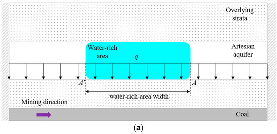 The following assumptions are made for drawing the general law: (1) for the model, the deformation of coal seam and roof strata meets three basic assumptions of material mechanics; (2) for the stress, the water level and water pressure in the area before and after drainage are uniform, all strata are uniformly stressed, and the differences in stress transfer caused by different rock joints are ignored; (3) for the boundary, only an ideal section of the working face is selected for the theoretical analysis because of the irregular shape in the actual water-rich area. In Figure 5a, before the implementation of drainage in the water-rich area, the strata of the artesian aquifer are intact, the overlying strata load q is uniformly transferred, and the load on the artesian aquifer is the original rock stress q. In Figure 5b, the origin O is the center of the water-rich area. After drainage in the water-rich area, the pore water pressure decreases, forming a pressure relief zone. The support capacity of the upper roof in the drainage range of the water-rich area decreases to q1 (A′A section), and the rock mass stress in A′C′ and AC sections increases, forming a pressurized zone. The stress distribution in the pressurized zone can be simplified into a triangular linear distribution (the maximum stress is q2). The original rock stress in the C′D′ and CD sections remains unchanged, forming a pressure stabilization zone. Let the length of the OA (OA′) section be l, AC (A′C′) section be a and the CD (C′D′) section be b, and then the stress distribution in D′D section is as follows: