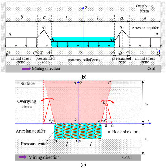 As can be seen from Figure 5 and Formula (2), the stress distribution after drainage is ideally symmetric with respect to the origin O, which means equal stress is transferred to both sides after drainage. Therefore, it just needs to make a detailed analysis of the stress distribution in the OD section on the right side of the origin O, as shown in Figure 5c. In Figure 5c, h1 is the distance from the top of the artesian aquifer to the coal seam (m); h2 is the distance from the top of the artesian aquifer to the surface (m); and α is the displacement angle of overlying strata in the water-rich area caused by drainage. (Compared with mining, the support of the artesian aquifer on its upper strata still exists in spite of a decline in support effect. Moreover, the overlying strata over the aquifer will suffer from fracture bands, but caving bands will not occur or the overlying strata will not stay in a completely overhanging state).
