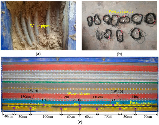 Physical simulation model: (a) water pipes laying; (b) pressure sensors; and (c) test model layout. The different numbers are stress measuring points.