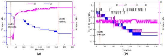Stress changing curves of each measuring point after drainage: (a) no. 8, no. 9; and (b) no. 1–no. 4.