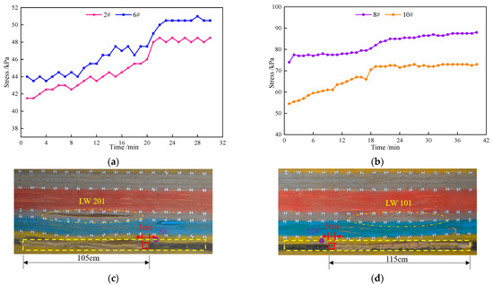 Figure 8b shows the stress changing curves at the no. 10 measuring point with LW101 excavated for 110~115 cm and at the no. 8 measuring point with LW201 excavated for 100~105 cm. At this time, the no. 10 measuring point is 120 cm distant from the open cutting of LW101 and 5 cm from the advancing position of LW101; the no. 8 measuring point is 110 cm from the open cutting hole of LW201 and 5 cm from the advancing position of LW201. It can be obtained that the two measuring points almost present the same stress growth trend, and the initial stress of the no. 8 measuring point is 19.5 kPa higher than that of the no. 10 measuring point. When the two working faces are advanced to 5 cm away from the measuring point, the stress of the no. 8 measuring point is 15 kPa higher than that of the no. 10 measuring point. The stress difference is similar to the stress increment of 16 kPa at the no. 8 measuring point after drainage in Figure 7a and Figure 8c,d demonstrates the spatial relationship between the working face and the stress measuring point when LW101 is excavated for 110~115 cm and LW201 for 100~105 cm.