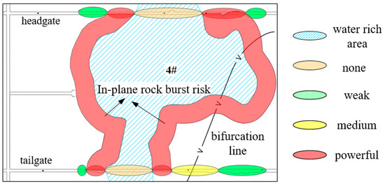 It can be seen that it is easy to induce the rock burst when the working face is advanced to the pressurized zone, which is also consistent with the rock burst location on 10 October. On this basis, the rock burst risk areas after drainage are re-predicted and re-divided for the surrounding area of the no. 4 water-rich area, including two no rock burst risk areas, four weak rock burst risk areas, one medium rock burst risk area and six powerful rock burst risk areas, as shown in Figure 11 and Table 4.