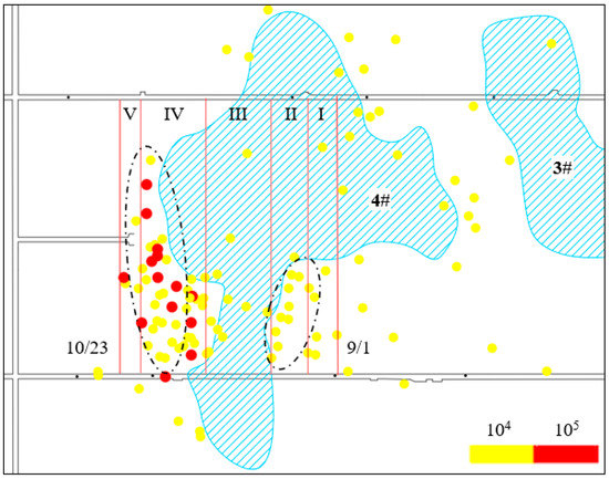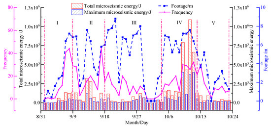 Each microseismic event has rich temporal and spatial information [43]. Real-time monitoring and processing of microseismic events can identify the occurrence location and intensity of microseismic events, further determining the stress transition inside coal rock masses. Figure 12 shows the relationship between daily footage and daily microseismic energy of LW22106 from 1 September 2019 to 23 October 2019. Figure 13 is the plane projection of microseismic events above the 4th power of LW22106 during this period. It can be seen that mining Zone I from 1 September to 9 September was partly under the water-rich area and partly outside the influence range of drainage, and the microseismic energy just had a small change with the increase in mining speed. From 10 September to 18 September, mining Zone II was partly under the water-rich area and partly within the pressurized zone, and the microseismic energy increased significantly at a high mining speed compared with Zone I. Mining Zone III from 19 September to 4 October was almost under the water-rich area, and the microseismic energy was still very small in spite of a high mining speed (maximum 8.8 m/d). From 5 October to 14 October, most of mining Zone IV was within the pressurized zone, and the high mining speed resulted in the maximum daily energy and a significant increase in total microseismic energy. Most of mining Zone V from 15 October to 23 October was not affected by water drainage, and the microseismic energy was changed little with the changing mining speed. The red line in Figure 13 represents the footage of the working face. It can be found that the microseismic events mostly occurred within the pressurized zone, which proved that this zone had a high degree of concentration with the working face being advanced here. Therefore, rock burst appeared on the working face on 10 October.