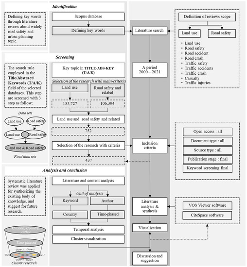 This paper utilizes a set of essential publications by focusing on scientific articles on road safety related to land use that analyzed, visualized, and displayed the relationships among the publications to identify their interrelationships. This study used VOSviewer (Visualization of Similarities Viewer) and CitesSpace (6. 1. R6, Chaomei Chen, Philadelphia, PA, USA). VOSviewer was applied as a tool for cluster analysis and visualizing bibliometric networks or maps [60,61]. CiteSpace is widely used for literature analysis and diverse visualization, which is suitable for evolutionary assessment based on the co-occurrence of keywords [62,63,64]. These networks include a variety of publications comprising of journals, researchers, or individual publications [65] and constructed based on citation, co-authorship, co-occurrence, bibliographic coupling, and co-citation analysis [60,66,67,68]. Consequently, it was displayed for bibliometric graphic maps [69,70], in which both VOSviewer and CitesSpace visualization enabled the node of the dense network to display interactions. This tool can analyze large volumes of literature by applying two types of analysis which are co-occurrence and co-authorship [71]. Co-occurrence analysis contributes by constructing a term map, where the frequency of occurrence can be used to identify a keyword term’s potential [72]. At the same time, co-authorship analysis contributes to building an interaction or relationship among scholars in the same research field [73,74]. Visualization contributes to establishing network visualization, overlay visualization, and density visualization. Based on this application, the research can demonstrate the overview of road safety issues’ research status and identify the gaps, particularly related to the land use system.
