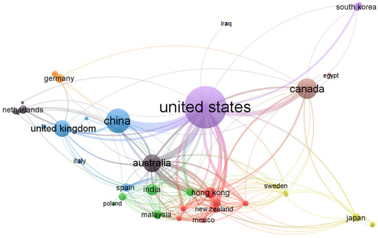 The authors also analyzed the annual publication trend, the issues of publication of bibliometric papers and the country of study. The number of literature publications for the scope of the research based on Scopus data was initially examined through performance analysis and retrieval topics related to the specific keyword of “land use” and “road safety” between 2000 and 2021. Year-wise publication of bibliometric papers is a vital indicator of the development trend in this particular research area and a reflection of a change in the extent of the subject knowledge related to both keywords of “land use” and “road safety” (see Figure 3). It was found that publications on land use and road safety present an exciting trend, increasing over a number of years. When the initial stage of 2000–2010 was considered, 94 publications with an average annual growth of 8.55 were discovered. Between 2011 and 2021, 343 publications with an average annual growth of 31.18 were found. This publishing trend was doubled with the adoption of more understanding of the contributions of built environmental factors on road safety. Between 2000 and 2021, it was found that the number of publications showed a continually increasing trend, with increasing considerations for environmental factors, in relation to urban land use. However, an increase and decrease in specific years were also discovered since 2000, as illustrated in Figure 3. It was revealed that the co-authorship map among 68 countries (areas) could also be visualized by using network visualization. A data mapping for each node representing the countries of the current study was displayed. The greater node size shows the number of publications, while the links between the nodes represent the collaborations. The greater width of the link shows closer collaborations. This analytical approach could help to present indices to demonstrate the potential collaboration among several countries in this research.
