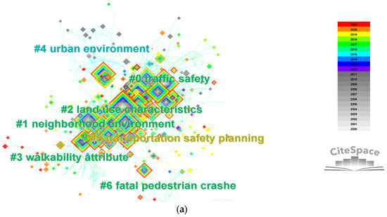 Road safety and land use studies are highly multidisciplinary research topics. Thus, the research field originates from different domains (e.g., transportation planning, urban planning, road safety, land use planning, law, built environment, infrastructure planning, medicine, health, traffic engineering, etc.). Analyzing the term co-occurrence map based on text data can provide most of the research status. Figure 5a,b demonstrate visualizations where each node displayed represents the abstract keyword through the time phase, while links between nodes represent the connection. The data revealed that “traffic safety” is the most frequent term, followed by “neighborhood environment”, “land use characteristics”, “walkability”, “urban environment”, “transportation safety planning”, and “fatal pedestrian crashes”. Furthermore, the data indicated that the keywords in the abstract are more related to road aspects (e.g., crash, casualty, traffic safety, accident, crashes, road safety, etc.) than land use aspects (such as environment, neighborhood, land use). In addition, the critical term also relates to “method” or “technique of analysis” in terms of assessment, review, traffic analysis zone, geographic information system, etc. These results further reinforce the highly multidisciplinary characteristics of the scope of this research area.