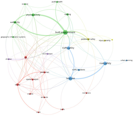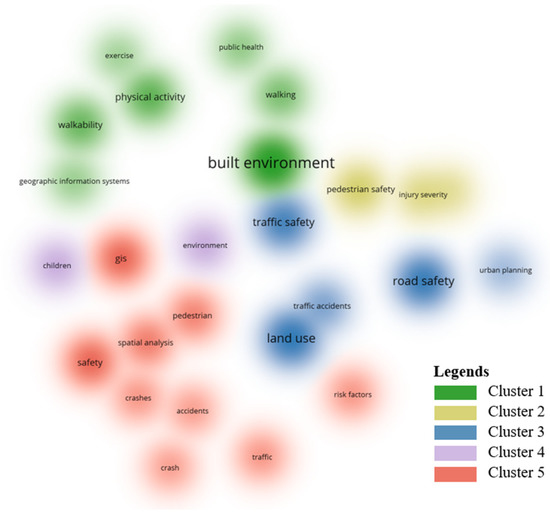 The top 10 high-frequency keywords are “built environment” (14.55% occurrences), “land use” (10.22% occurrences), “road safety” (8.98% occurrences), “traffic safety” (7.43% occurrences), “physical activity” (5.57% occurrences), “GIS”, “safety”, walkability (4.64% occurrences), “pedestrian safety” (3.72% occurrences), “spatial analysis” and “traffic accidents” (3.41% occurrences), respectively. The correlation analysis between the keywords revealed five clusters, as shown in Figure 7. Cluster 1 represents “physical analysis”, which relates to the built environment, GIS, physical activity, walkability, etc. Cluster 2 represents “vulnerability related to pedestrian safety”, which is especially important for road safety planning. Cluster 3 represents “land use and road safety”, which relates to land use planning, urban planning, etc. Cluster 4 represents “children”. Finally, cluster 5 represents “accident”, which relates to accidents, crashes, and safety. The analysis indicated that road safety and land use were performed by applying several road users, travel modes, approaches and techniques.