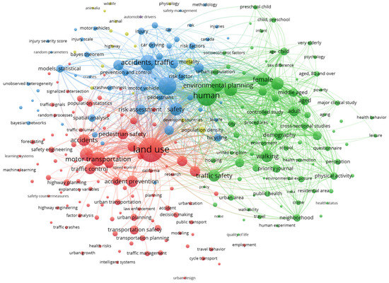 Analysis of the keywords co-occurrence map based on the index of keywords indicated in the publications showed 2798 keywords selected from these publications. Only those that appeared at least five times were considered for analysis, as shown in Figure 8. The following details covering a total of 290 network nodes were obtained from the data analysis. The top 10 high-frequency keywords are land use (4.49% occurrences), human (3.00% occurrences), traffic accident (2.52% occurrences), motor transportation (1.70% occurrences), roads and streets (1.45% occurrences), environment design and planning (1.43% occurrences), respectively.