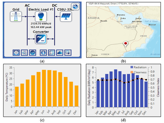 Figure 2. Homer Model of the grid-connected PV system. (a) Model; (b) site location; (c) temperature; (d) solar radiation.
