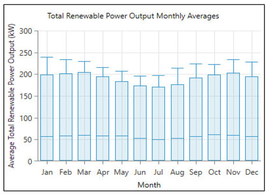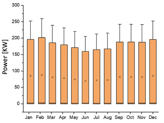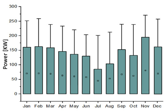 The monthly average variation of the PV power output is presented in Figure 6. It shows that the maximum energy was produced during the months of February, March, October, and November. During these months, the daily average production was 65 kWh, which is equivalent to 1154 kWh of produced energy daily. The annual max value of generated power was around 240 kW, whereas the daily average max of power was 200 kW during these months. The minimum produced power was found in June, July, and August.