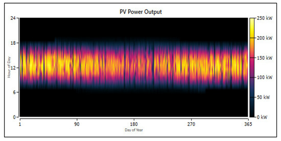 The Homer-Pro model permits us to simulate the PV power output for the complete year based on the variations of solar radiation, temperature, and clearness index. The obtained results using the Homer-Pro model are presented in Figure 5, Figure 6 and Figure 7. Figure 5 shows that the maximum produced power is 250 kW.