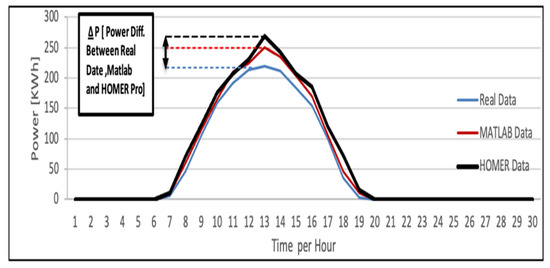 The yearly generated energy, calculated using Homer-Pro, was 444,320 kWh. Despite this, the power variation profile was similar to the developed analytical model, as shown in Figure 7. However, a difference between the calculated total energies was observed. This can be explained by the different models used by Homer and Matlab to calculate the output power. Indeed, Homer-Pro contains prepared PV panel parameters and the user cannot change them. The analytical model allows us to adjust the parameters of the PV array according to the PV panel characteristics used. Moreover, Homer-Pro uses the average solar radiation and the temperature average to predict the PV power. For the analytical model, the real data of the solar radiation variation and temperature were used as inputs for the model.
