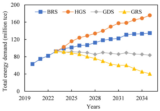 Figure 3 illustrates the trends in energy demand under various scenarios from 2020 to 2035. The BRS shows a stable upward trend in total energy consumption in Nanjing, increasing from 63.24 million tce (tons of coal equivalent) in 2020 to 134.71 million tce in 2035, with an average annual growth rate of 4.76%. Under the HGS, Nanjing’s energy demand grows more significantly than the BRS, reaching 175.73 million tce by 2035, with an average annual growth rate of 7.49%, about 1.6 times that of the BRS. The GDS shows an upward trend in total energy demand from 2020 to 2023, reaching 92.21 million tce in 2023. The total energy demand from 2024 to 2035 is controlled at about 83.57–85.48 million tce, with an average growth rate of 0.09% from 2020 to 2035. The GRS peaks at 92.10 million tce in 2023 and then gradually decreases to 40.57 million tce in 2035, with an average annual growth rate of −0.56%. Therefore, the total energy demand in Nanjing under the GDS and GRS is significantly lower than the other two scenarios due to the focus on increasing energy efficiency and promoting the use of renewable energy sources. The total energy demand in Nanjing under the GDS shows a slight increase initially but remains stable at a lower level for the remainder of the period. In contrast, the total energy demand under the GRS peaks in 2023 and then decreases over time, indicating the success of efforts in transitioning towards a more sustainable energy system. Izabela et al. [31] studied the path of ecological transformation of energy structure in European countries and found that the most effective method in achieving environmental goals is the rapid and consistent abolition of coal, replacing it with renewable energy, nuclear energy, and hydropower.