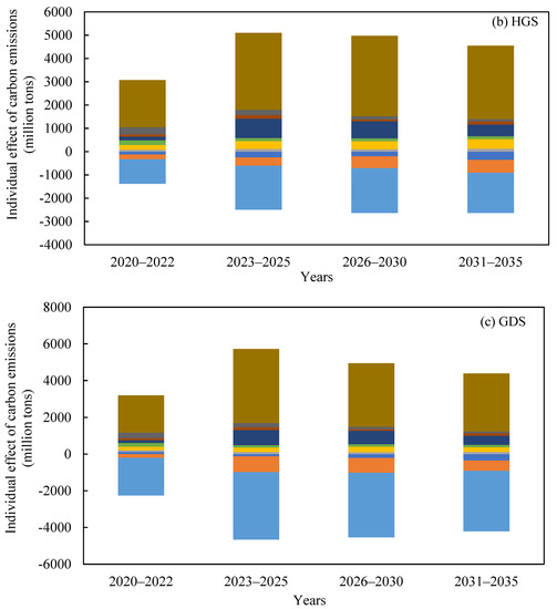 The industrial energy consumption intensity effect, energy consumption structure effect, and electricity production structure effect have strong emission-reduction effects, especially in the GDS and GRS scenarios. From 2020 to 2035, the cumulative emission reduction in the industrial energy intensity effect in the four scenarios is 8557.62, 8204.55, 4538.79, and 3938.83 million tons, and the emission-reduction contribution rates are 38.68%, 33.45%, 44.92%, and 49.09%, respectively. The emission-reduction contribution of the energy consumption structure effect in the four scenarios is 6.38%, 8.67%, 13.32%, 16.62%, respectively. The emission-reduction contribution of the production structure effect of electricity in the four scenarios is 6.57%, 5.63%, 7.09%, and 9.40%, respectively.