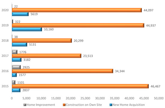 By the end of 2020, the Fondo MIVIVIENDA [31] reported a total of 821 credits granted under the Complementary Financing of the Techo Propio Program, and 7541 credits granted under Nuevo Crédito MIVIVIENDA. The regions that benefited the most from MIVIVIENDA credits were Lima, Lambayeque, Piura, and La Libertad. Notably, despite the crisis, the number of MIVIVIENDA Verde credits, which offer environmentally friendly housing options, experienced the smallest decrease among MIVIVIENDA products, with 5519 bonds granted.