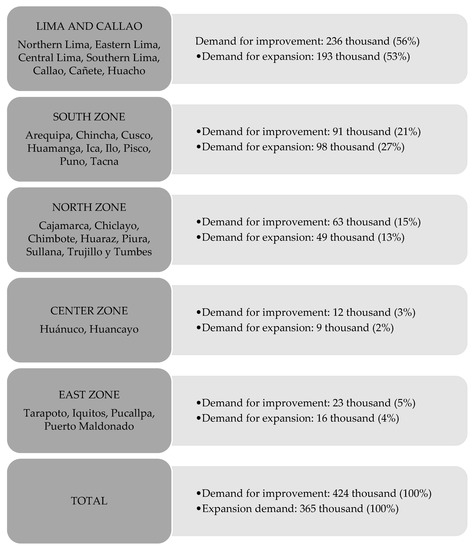 To assess the housing demand at a national level, the Fondo MIVIVIENDA [33] conducted a comprehensive Housing Demand Study focusing on major cities across the country. The study aimed to estimate the demand for single-family housing as well as the requirements of homeowners seeking to improve or expand their existing homes within socioeconomic levels B, C, and D. These findings were instrumental in determining the effective demand for housing.