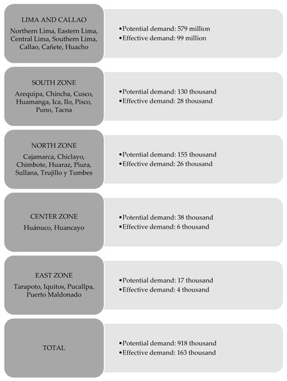 In the case of “non-owner” households, despite a potential demand of 918,000, the effective demand amounted to 163,000, which accounts for less than 20% of the total potential demand. Notably, 61% of the effective demand is concentrated in Lima and Callao, 17% in the South, 16% in the North, 4% in the Center, and 2% in the East. These proportions align with the population distribution across different regions of the country, as depicted in Scheme 2.