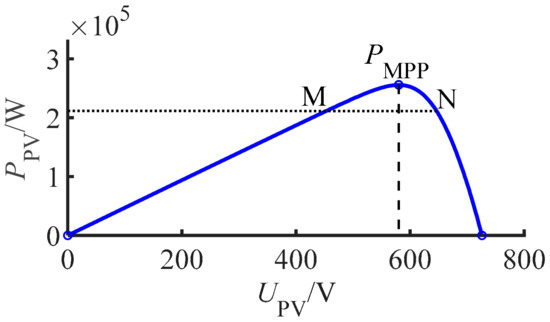 As shown in Figure 6, M and N are the power points on the left and right sides, respectively, of the PV array operation when the PV system leaves a certain amount of backup power. When there is an imbalance between the power output of the synchronous generator set and the load power, the system frequency will fluctuate significantly. Under the action of the unbalanced power, the equation of rotor motion in the synchronous generator set is illustrated in Equation (7) [26]: