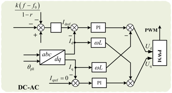 From Equation (13), the regulation factor k and the virtual inertia time constant Hdc are important influencing parameters of the control strategy proposed in this paper, and it can be seen that the regulation factor k and the virtual inertia time constant Hdc are proportional to the incremental DC voltage ΔUdc on the grid-connected side of the inverter. When the regulation factor k and the virtual inertia time constant Hdc increase, ΔUdc then increases and the more support power the PV plant can provide to the system, which can weaken the volatility in the dynamic process of the system frequency. Therefore, we can improve the grid-side inverter control strategy, as shown in Figure 7.