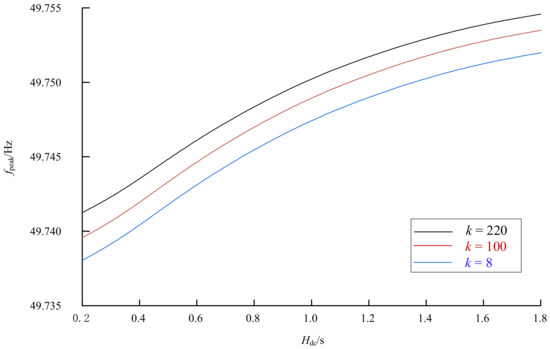 According to Equation (15), under different control coefficients k, the relationship between the initial value df/dt of grid frequency change rate and the minimum drop value fpeak of grid frequency and the inertial time constant Hdc is shown in Figure 9. From Figure 9, it can be seen that the change of control coefficient k has no effect on the initial value of grid frequency change rate; as the time constant Hdc increases, the lowest frequency drop increases.