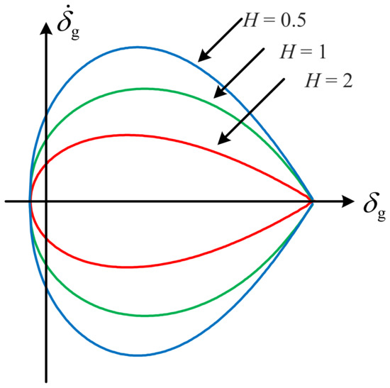 Firstly, Figure 11 shows the effect of the equivalent inertia H on the system’s domain of attraction (i.e., the domain of stability). It is noticed that an increase in inertia reduces the area of the system’s domain of attraction, meaning that it is detrimental to the stability of the system. In other words, although inertia reduces the rate of change of the frequency and the equilibrium point translation range of the system when subjected to external perturbations, the system frequency takes longer to adjust to the steady-state value. On the other hand, a small inertial system has a larger area of the attraction domain, but the system can be shifted significantly when disturbed, which can also cause the system to escape from the attraction domain and cause system instability. The control rate of virtual inertia therefore requires a trade-off between the attraction domain and the immunity of the system to find a compromise.