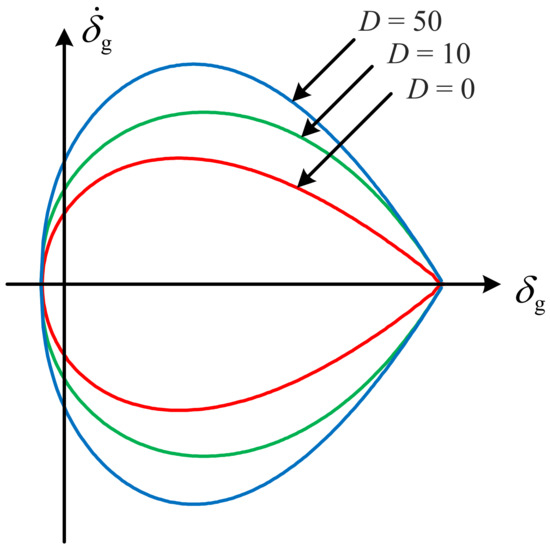 Figure 12 illustrates the effect of the equivalent damping factor D on the attraction domain of the system. An increase in damping increases the area of the attraction domain of the system and improves the stability of the system. In addition, the damping factor can increase the equivalent damping ratio of the system, which can suppress the power and frequency oscillations of the synchronous generator. Therefore, by providing primary frequency regulation for the system through PV load shedding operation, the stability and dynamic performance of the system can be effectively improved and the oscillations and frequency dips of the system can be suppressed.