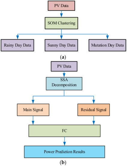 PV power prediction process. (a) SOM clustering process. (b) Secondary decomposition and power prediction.