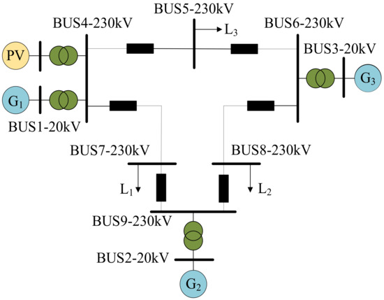 Through the above theoretical elaboration and analysis, a three-machine and nine-node system model, as depicted in Figure 14, is established in PSCAD/EMTDC to verify the theory’s rationality. The simulated system consists of three synchronous generating units, G1, G2, and G3, with a capacity of 300 MW, a PV module device with a capacity of 50 MW, and three loads.