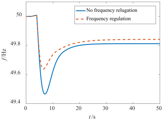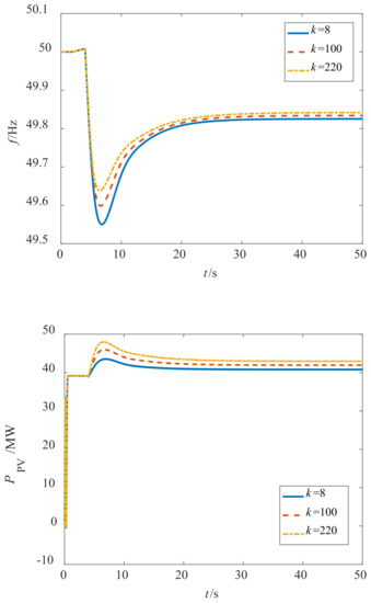 When the regulation coefficient k is taken as 8, 100, and 220, the system frequency rises continuously, and the PV facility exploits the reserve power to constantly generate incremental active power to suppress the frequency drop. The lowest value of frequency drop is 49.55 Hz when k = 8; the lowest value of frequency drop is 49.599 Hz when k = 100; the lowest value of frequency drop is 49.637 Hz when k = 220. Therefore, as the regulation coefficient increases, the greater the inertial power provided by the PV device, and the maximum deviation in frequency variation decreases and the ultimate steady-state value of frequency increases.