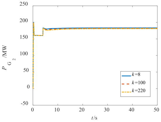 When a load consuming 70 MW of active power is put in at t = 4 s, the simulation results for the system frequency, the PV equipment’s output power, and the output power of the synchronous generator G2 when the regulation factor k is changed are pictured in Figure 18.