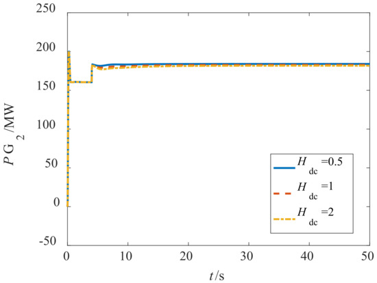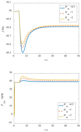 When a load consuming 70 MW of active power is put in at t = 4 s, the simulation results for system frequency, PV device output power, and synchronous generator G2 output power are displayed in Figure 19 when the virtual inertia time constant Hdc is varied.