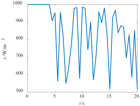 The previous section’s environmental conditions for the simulated operation were carried out at a constant light intensity. Considering that the PV module equipment in the actual operation of the grid is affected by environmental factors such as light intensity, the PV output power will vary in size and, therefore, the system frequency will fluctuate accordingly. As depicted in Figure 20, the light intensity is set to fluctuate once every 0.5 s interval.