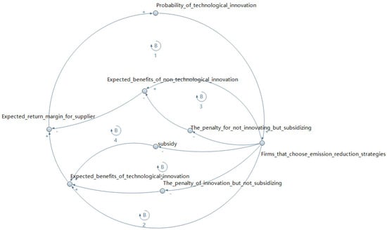 Loop4: Firms that choose emission reduction strategies→Subsidy→Expected benefits of technological innovation→Expected return margin for suppliers→Probability of technological innovation→Firms that choose emission reduction strategies