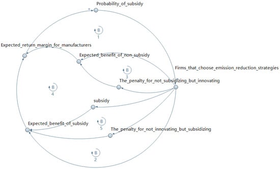 Loop5: Firms that choose emission reduction strategies→The penalty for not innovation but subsidizing→Expected benefit of subsidy→Expected return margin for manufacturers→Probability of subsidy→Firms that choose emission reduction strategies