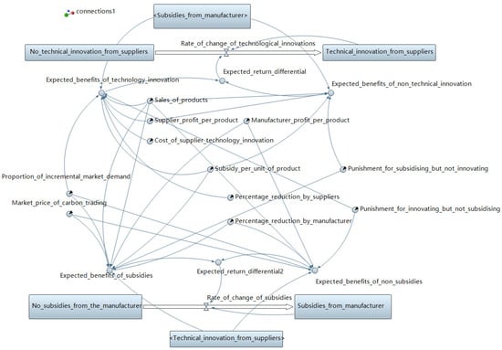 The extent to which suppliers engage in technological innovation is influenced by factors such as the price of carbon, the subsidy per unit of product, and the penalties incurred under different decisions. On the other hand, whether manufacturers subsidize suppliers is determined by factors such as the price of carbon, the penalties incurred under different decisions, and the subsidy per unit of product. The causal loop diagram of the system dynamics model provides a clear representation of the interaction between these elements. This paper proposes a model for reducing emissions in the supply chain, which is divided into two subsystems: a manufacturer technology innovation strategy and a supplier subsidy strategy. The paper analyzes the cause–effect relationships and establishes causal loop diagrams to better understand the intrinsic factors at play.