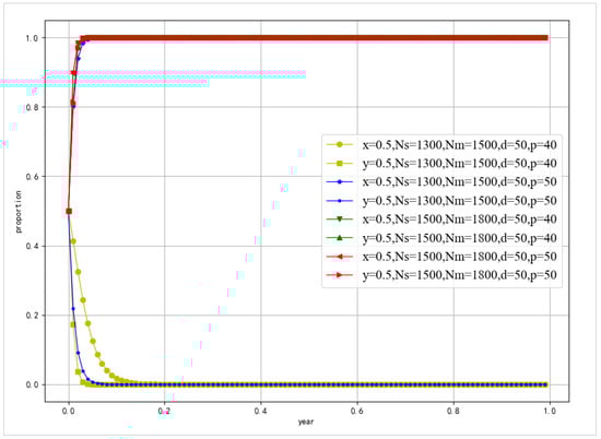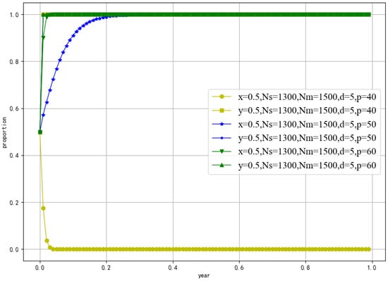 This study examines the impact of carbon pricing on upstream and downstream enterprises in a supply chain when the agreed punishment strategy is medium-level () and high-level (), and the manufacturer’s subsidy decision is a low-level subsidy strategy (d = 5). The study investigates whether the decision to reduce emissions has an impact. Figure 4 shows the evolutionary impact of changes in carbon price (p) on the decision-making behavior of supply chain enterprises while keeping other parameters unchanged. The horizontal axis represents the simulation time, and the vertical axis represents the probability of the enterprise choosing to reduce emissions. The line segments in the figure represent the change trend of the enterprise’s emission reduction probability at different price levels.
