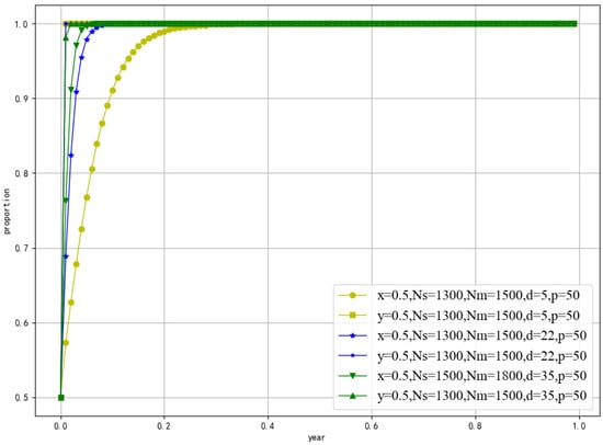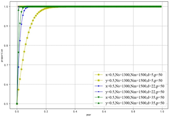 This study examines the impact of subsidy strategy on emission reduction decisions of upstream and downstream enterprises in the supply chain when the punishment agreed by both parties in the supply chain is the medium-level strategy () and the carbon price is in the medium-level mode (p = 50). Figure 7 illustrates the evolution of penalty strategy on enterprise’s decision-making behavior while keeping the other parameters constant. The line segment in the figure shows the change trend of the enterprise’s emission reduction probability for different values of d.