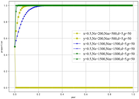 The use of punishment strategies serves as a fundamental method to incentivize both parties in the supply chain to comply with the terms of the contract. This approach can effectively motivate supply chain enterprises to reduce their emissions. In instances where a supplier implements technological advancements, a low-level subsidy strategy (d = 5) is typically employed by the manufacturer to incentivize the supplier’s efforts. The impact of penalty strategies on upstream and downstream enterprises in the supply chain is explored when the carbon price is in the middle-level mode (p = 50), while the initial value of other parameters remains unchanged. The figure below (Figure 6) illustrates the probability of enterprise emission reduction when different values are taken, displaying the trend of the evolution of the value change of the penalty strategy on the enterprise’s decision-making behavior.