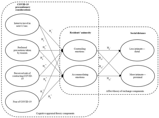 Over the last two years, we have focused little attention on considering residents and their perspectives on having tourists in their communities during the pandemic. The research that has been conducted tends to focus on one individual destination [,,], without necessarily considering the historical number of COVID-19 cases locally. The present work seeks to address these gaps by providing a more robust perspective on residents throughout the U.S. who live in counties with the highest percentages of reported COVID-19 cases to date. In so doing, we propose and test a conceptual model (informed by the cognitive appraisal theory and the affect theory of exchange) to determine the extent to which COVID-19 precautionary considerations inform residents’ animosity toward potential tourists in their community, ultimately to determine how such animosity translates into residents’ level of comfort in engaging with tourists (i.e., social distance). The results of this study aim to contribute to the cognitive appraisal theory and the affect theory of exchange in the context of the COVID-19 pandemic, broadening our understanding of the salient constructs contributing to residents’ social distancing from tourists. Additionally, this work seeks to inform tourism planning at the county level within the U.S. by way of the inclusion of residents’ perspectives.