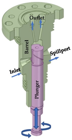 Numerous studies have been conducted on high-pressure fuel injection [1,2,3,4,5,6]. Due to high oil costs, there have been reliability issues with using low-quality fuel oil [5,6,7]. The major components of the catalysts are alumina-silicates with diameters of 5–150 µm, an oval shape, and hardness values close to grinding materials. Their reports create scratches on the moving surfaces and accelerate sticking or wear in reciprocating fuel pumps [2,5,6]. A marine high-pressure common rail system using MAP data and empirical calculations in AMESim was modeled by Wang et al. [8]. Their results showed the variation in rail pressure induced by each fuel injection cycle.