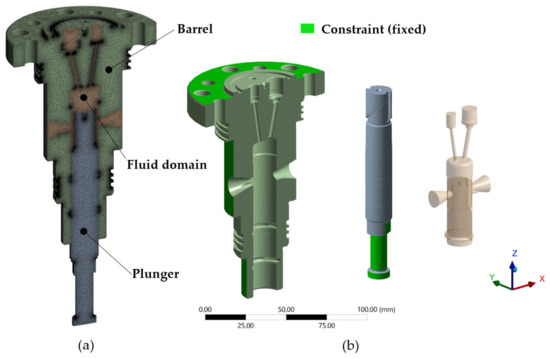 The dimension detail shown in Figure 2 illustrates the proposed marine fuel injection pump, especially the plunger and the barrel parts. To make it different from other models in the literature [5,7,11,12,14], the proposed model modified the plunger diameter to 23.9 mm and the plunger stem taper to 1.5° × 30 mm. Moreover, the mesh (tetrahedral shape) of Figure 3a depicts the computational model, and fine grids with a tetrahedral element were implemented in the region. Figure 3b illustrates the constraints and disassembly of the barrel, plunger, and fluid domain. In the areas impacted by compressed fuel oil, the plunger’s bottom half was fixed in all directions, and the ultimate supply pressure was implemented. The barrel top and side were fixed in anticipation of twisting in the x and y directions, and the highest supply pressure was also supplied to the compressed fuel oil-affected areas.